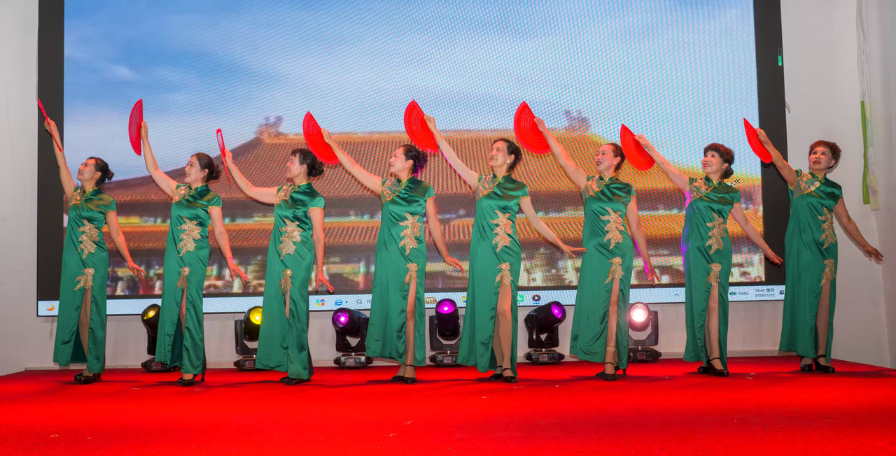 由林常靖、朱红等演出的旗袍秀把现场气氛推向高潮。旗袍是中国传统女性服饰的瑰宝,承载着民国时期以来的审美与文化记忆。当旗袍与舞蹈结合,不仅让这一非遗服饰“活”起来,更通过肢体语言赋予其新的生命力。舞蹈中的转身、抬手、步态,都与旗袍的剪裁、开衩、盘扣等细节相呼应,形成一种流动的视觉诗篇,使观众在美的享受中自然感受到中华文化的深厚底蕴。处秀风艺术团的舞者身着华丽旗袍,迈着优雅步伐,自信展示独属于他们的风采,岁月沉淀后的从容与优雅展露无遗。女声小组唱、男声独唱、乐器伴唱、三句半等节目,充分展现出艺术团成员的多才多艺,掌声与喝彩声此起彼伏。